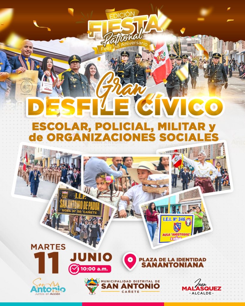 Celebrando sus 118° aniversario de San Antonio de Padua, el alcalde Juan Edgar Malásquez Jara, hace su extensiva y cordial invitación a toda la población en general al disfrute de un hermoso desfile cívico.